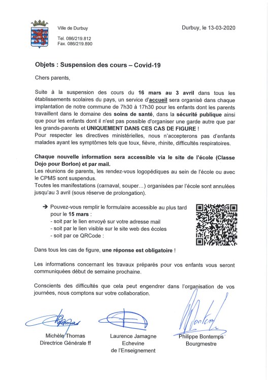 Voici le courrier du Pouvoir Organisateur de la commune de Durbuy concernant les mesures prises par rapport à la suspension des cours.