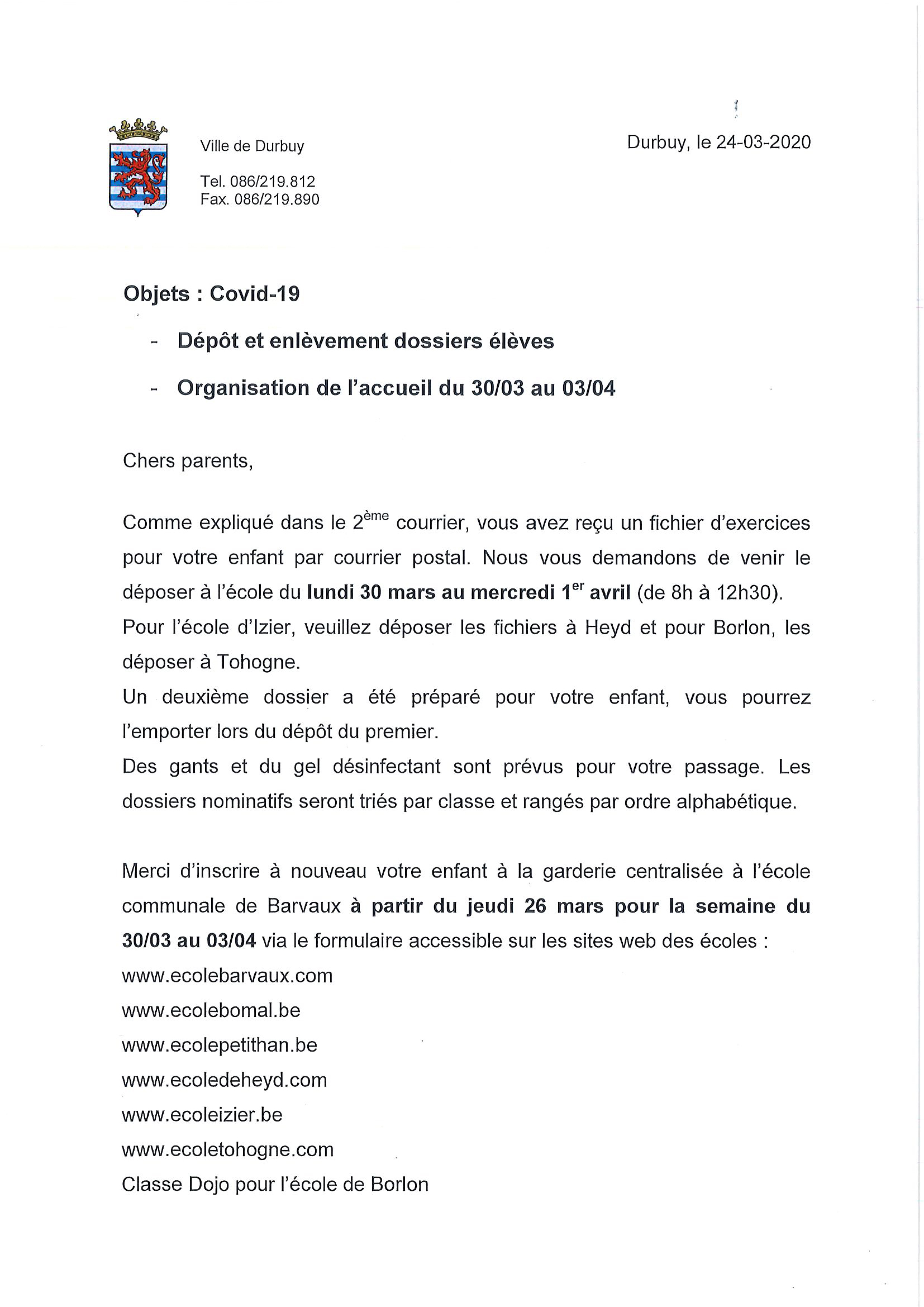Ce courrier concerne le dépôt et l’enlèvement des dossiers des élèves ainsi que l’organisation de l’accueil du 30/03 au 03/04.