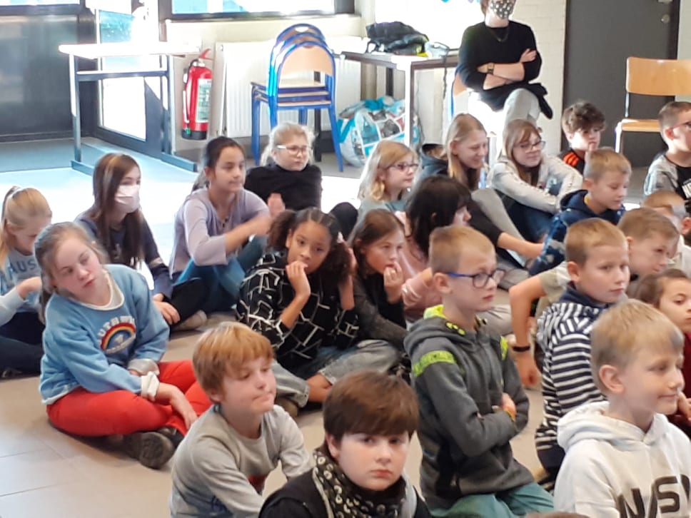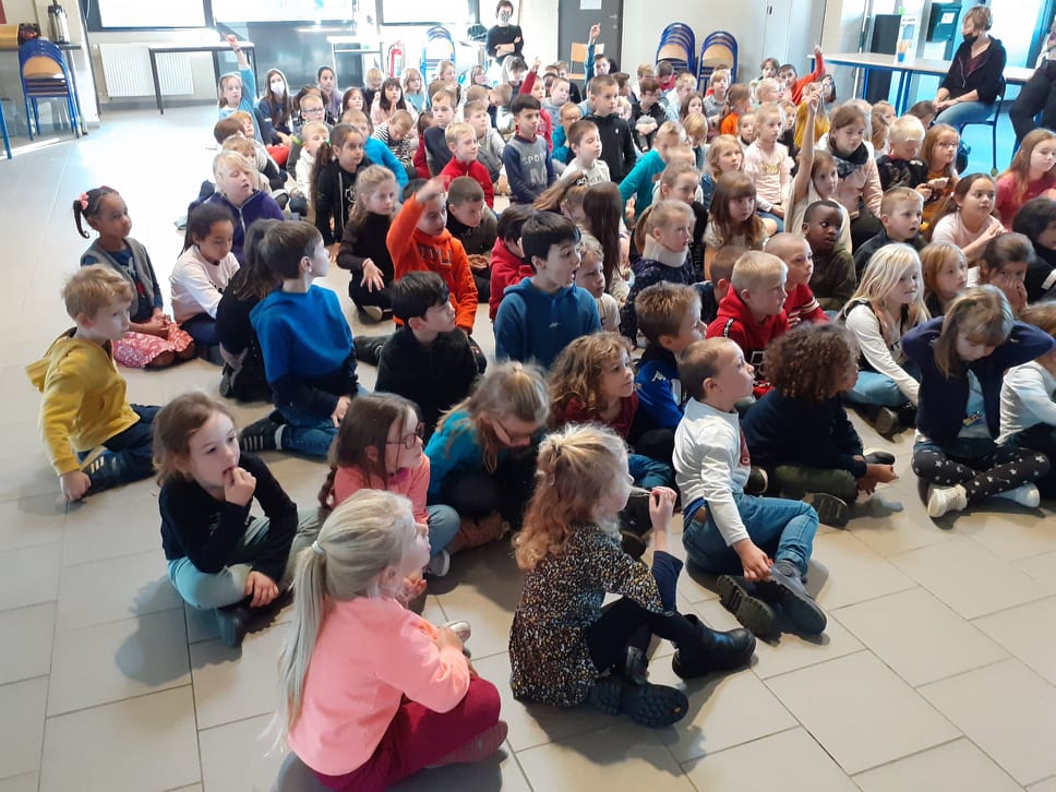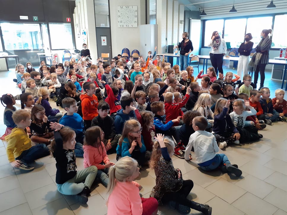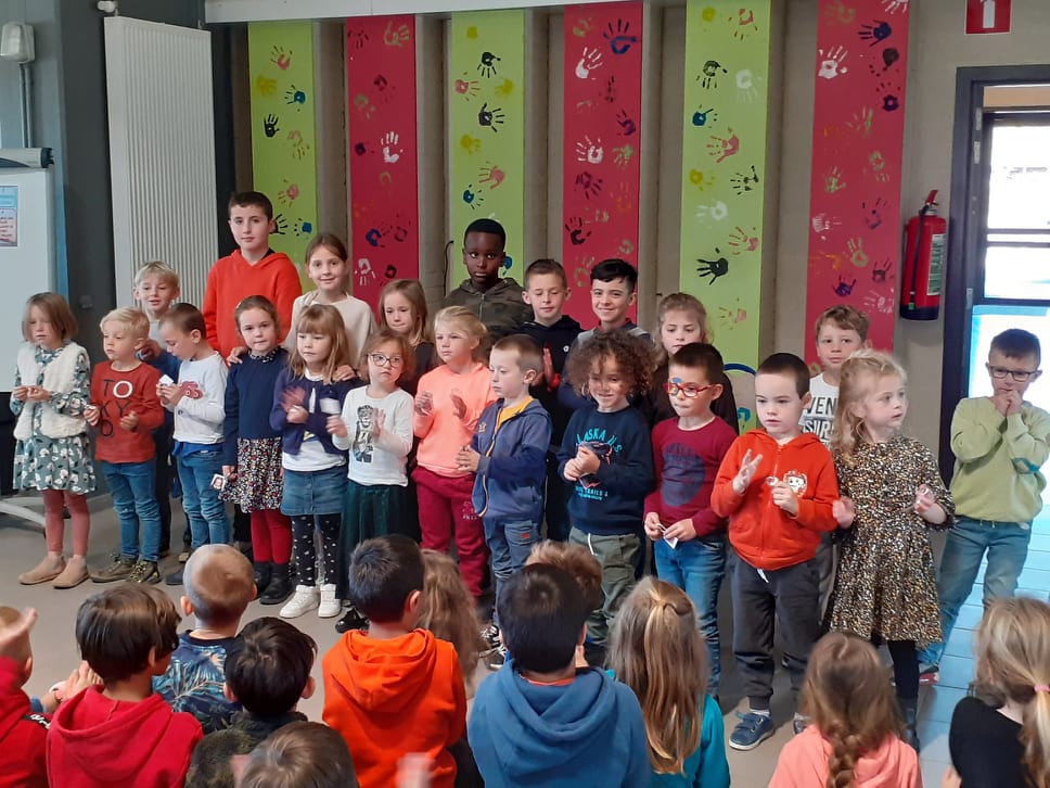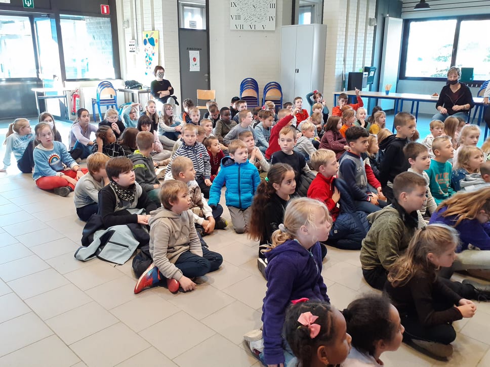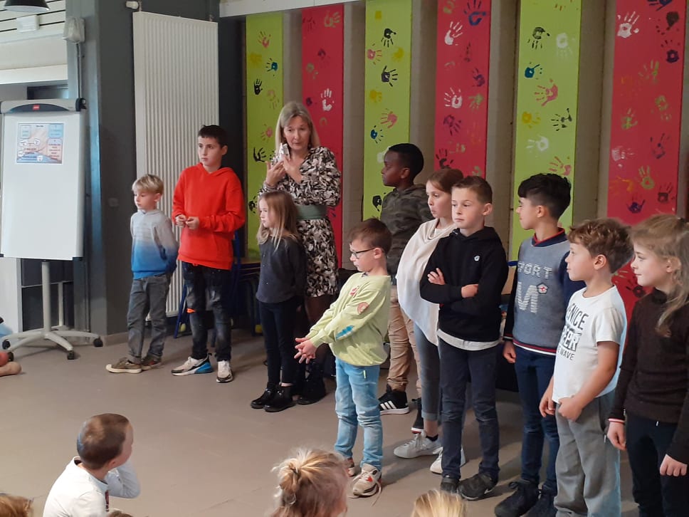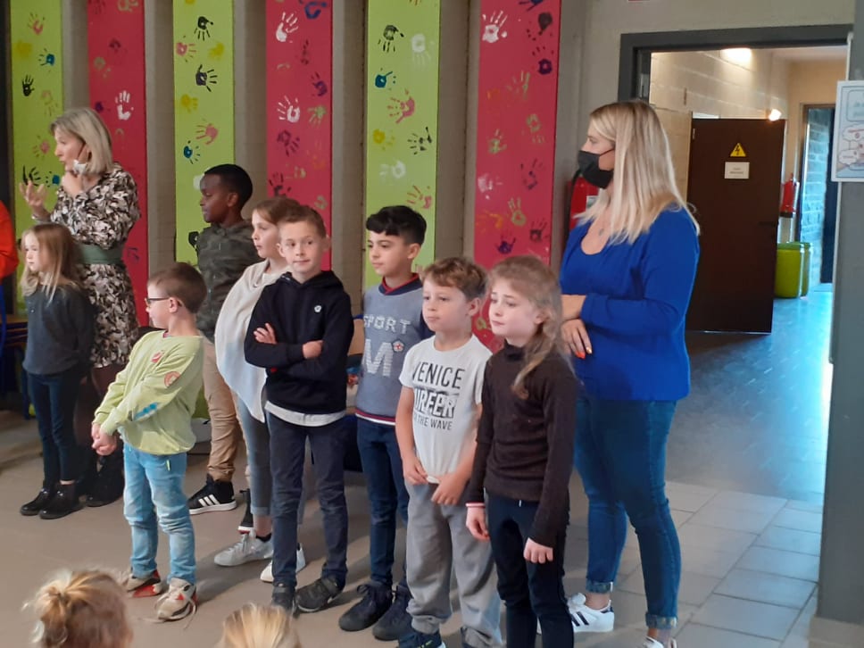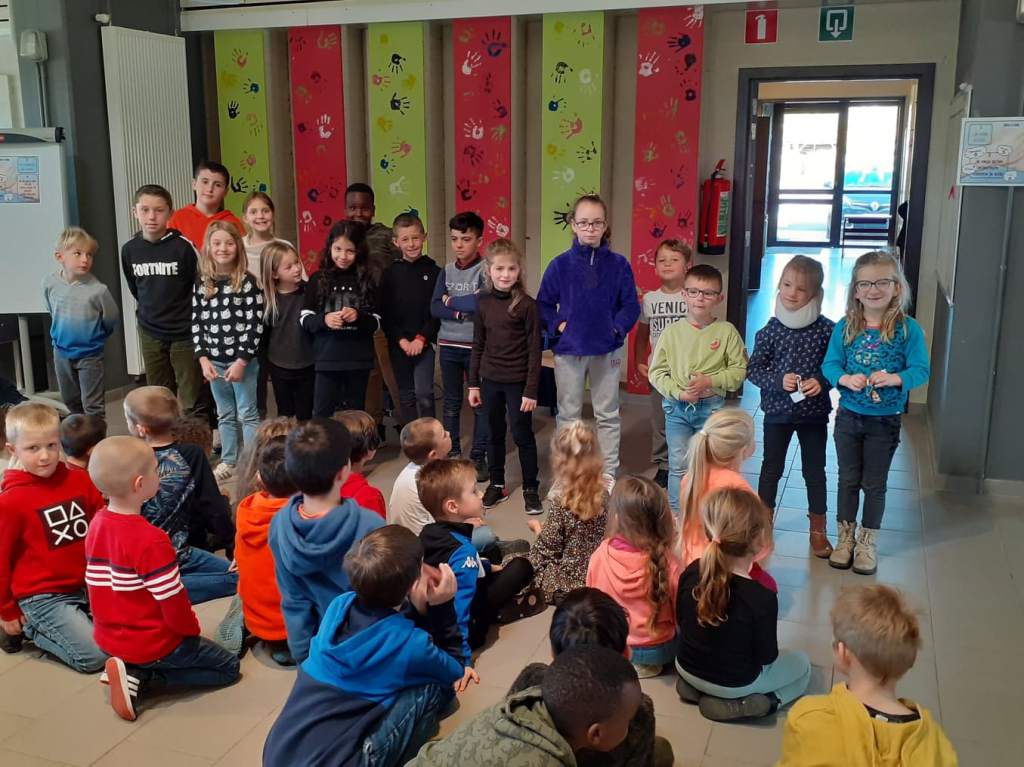 D’abord, les délégués se sont présentés devant toute l’école : Martin et Clémentine pour les P1-2A; Esther et Scott en P1-2B ; Idris pour les P3A ; Louis chez les P3B ; Éléonore et Lohan en P4 ; Chardi en P5 et Eliot en P6.