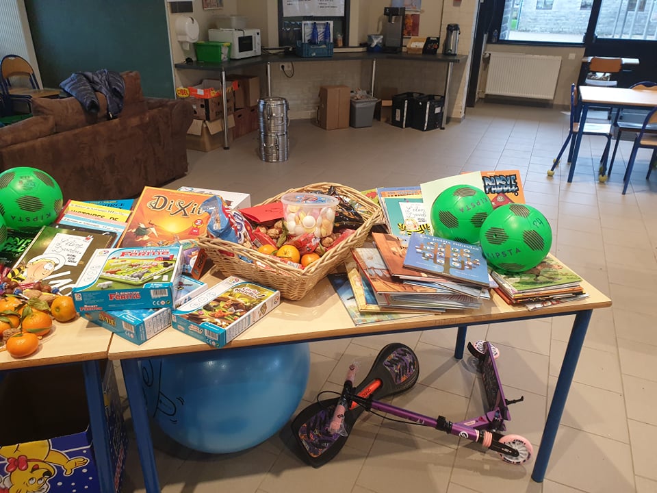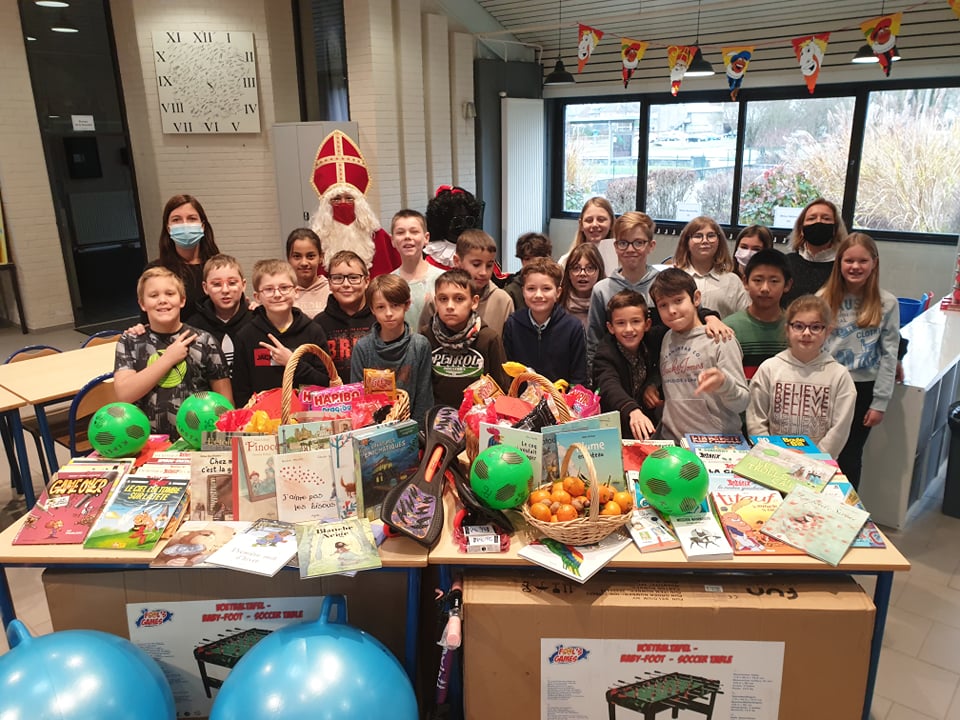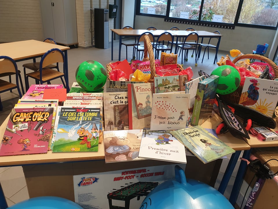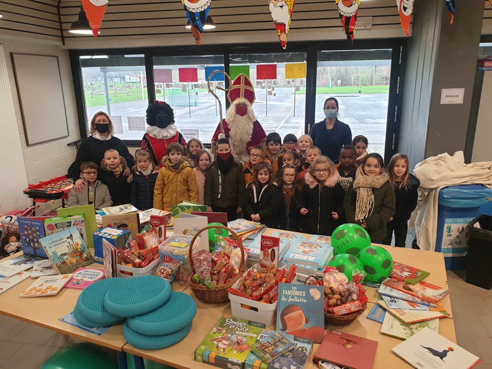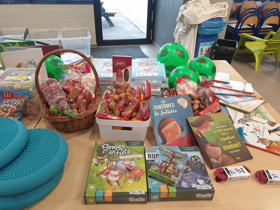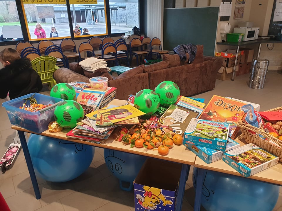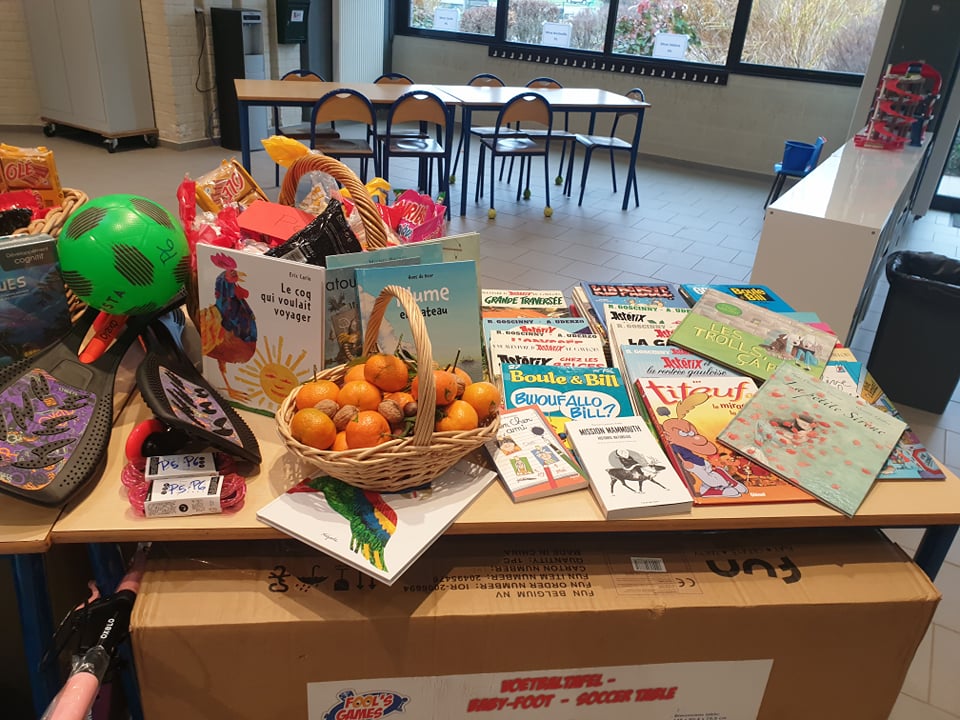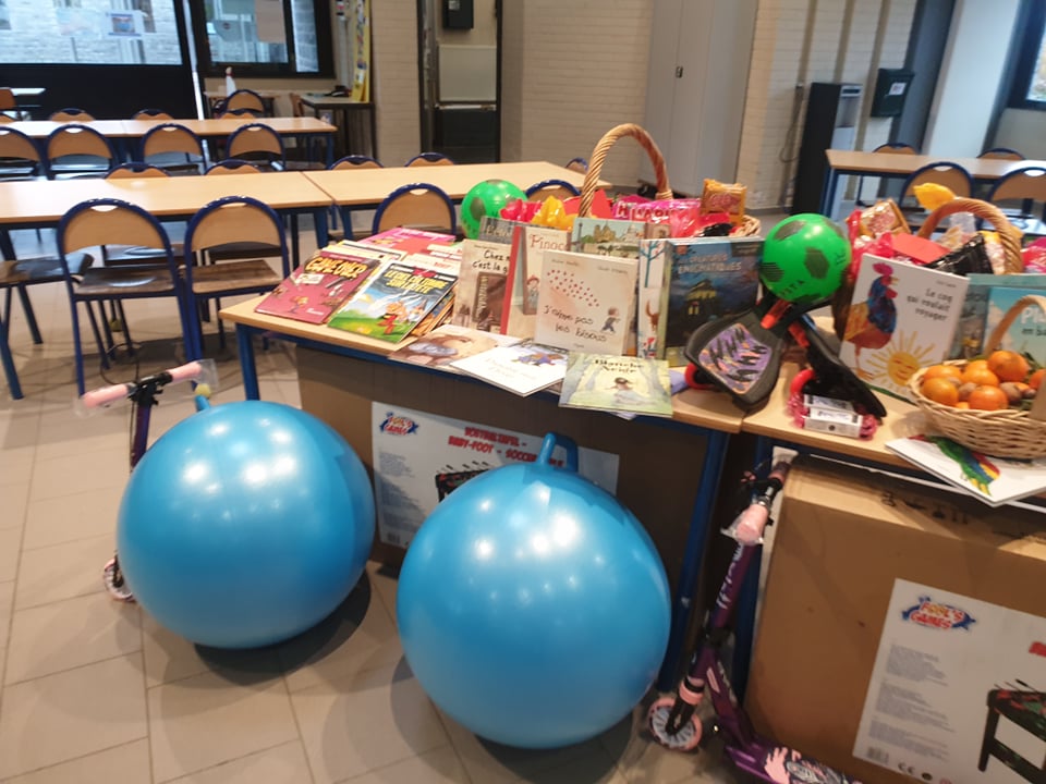 Il est arrivé bien chargé : des bonbons, mandarines, chocolats et surtout plein de livres, jeux d’intérieur et d’extérieur et équipement pour bien apprendre.