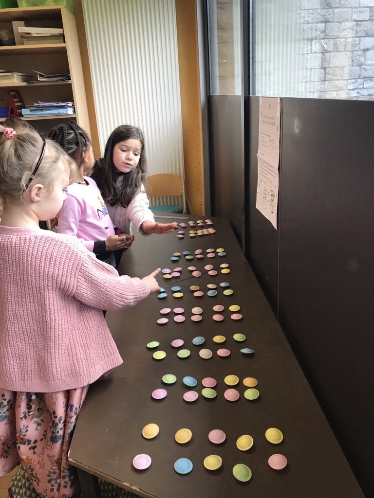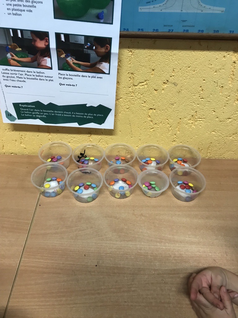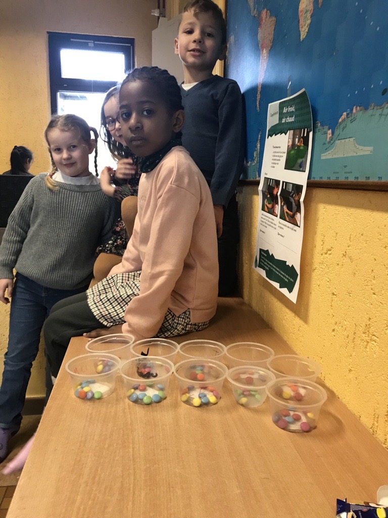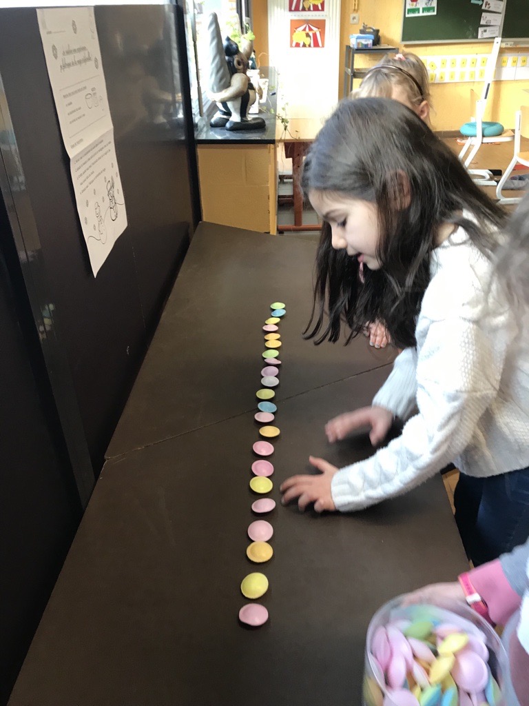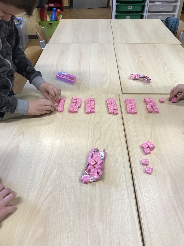 Nous avons compté et organisé 100 bonbons, pions, livres, poissons et avons réalisé une affiche pour présenter le travail en groupe.