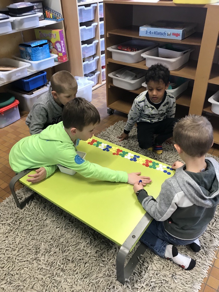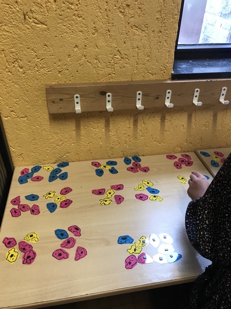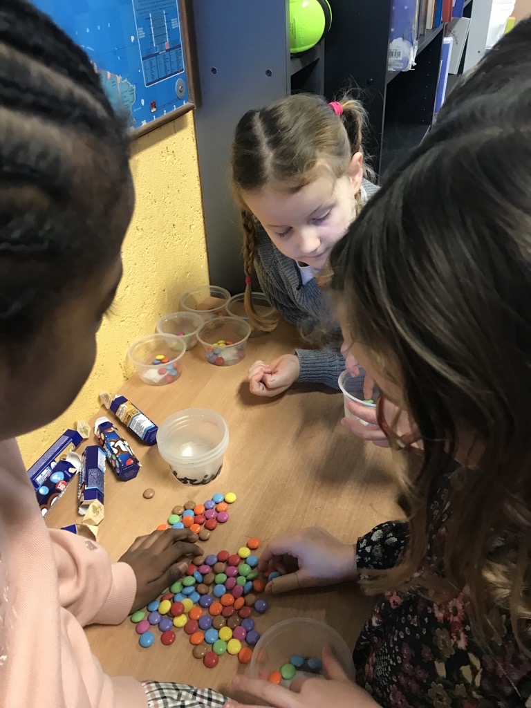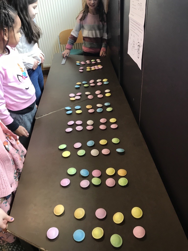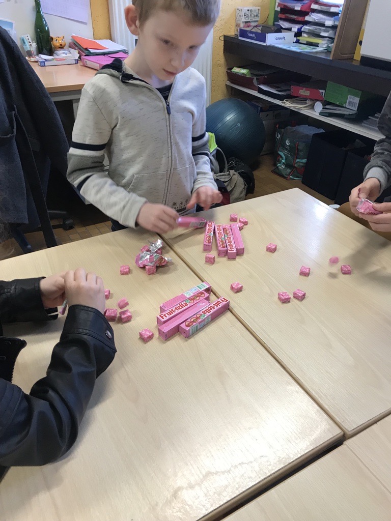 Nous avons compté et organisé 100 bonbons, pions, livres, poissons et avons réalisé une affiche pour présenter le travail en groupe.