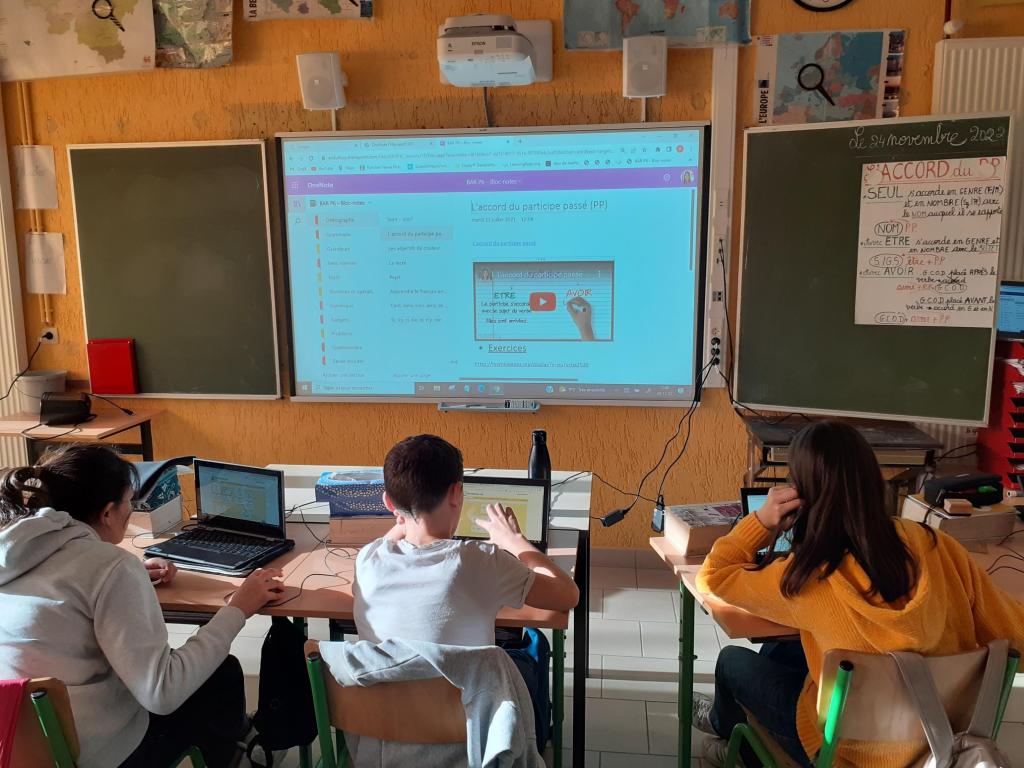 Ce jour, ils se sont connectés à OneNote afin de faire des exercices sur l’accord du participe passé. C’est plus amusant sur l’ordinateur que sur des feuilles !